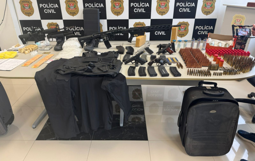 A Polícia Civil encontrou e apreendeu um arsenal que continha fuzis, pistolas, granadas e drogas na sexta-feira (10), no bairro Macuco, em Santos, litoral de São Paulo. Um casal, de 44 e 46 anos, responsável por armazenar e distribuir os produtos, foi preso em flagrante.