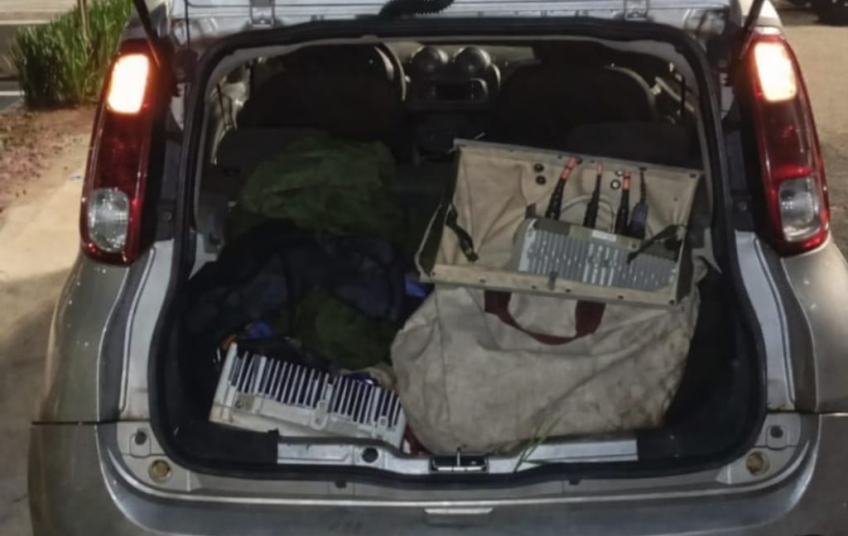 Durante a vistoria no automóvel, os agentes localizaram no porta-malas equipamentos de telefonia, além de ferramentas, cordas, alicate de grande porte, rádios comunicadores e cinto de segurança para trabalho em altura. Questionados sobre a procedência do material, os suspeitos apresentaram versões contraditórias e um deles confessou que os equipamentos haviam sido furtados de uma torre de telefonia localizada no bairro Santana, onde também foi constatado arrombamento.