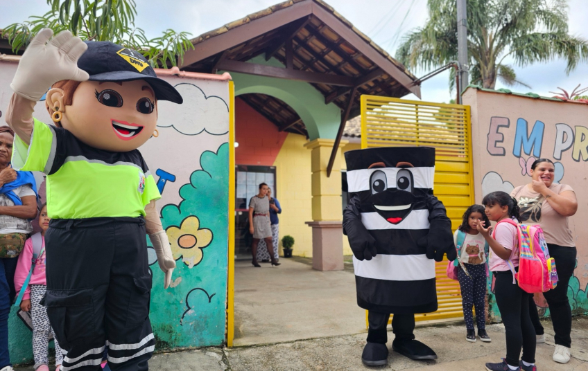 Outra ação de destaque ocorreu em frente à Escola Municipal de Ensino Fundamental Professor Antônio Lacerda Bacellar, no Jardim Serrano. A equipe de mascotes do Departamento de Mobilidade Urbana promoveu uma atividade educativa de trânsito, orientando alunos e familiares sobre segurança viária no entorno escolar. Personagens como Agentona, o Farol e a Faixa de Pedestres chamaram a atenção das crianças e reforçaram, de forma lúdica, a importância de atitudes seguras no trânsito.