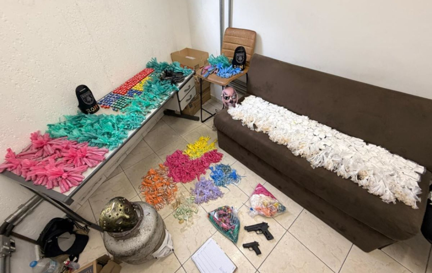 APREENSÃO - Ainda segundo o próprio suspeito, ele seria responsável pelo abastecimento de drogas na região e mantinha, dentro da residência, um botijão de gás com fundo falso utilizado para esconder parte do material ilícito. Durante a varredura no imóvel, as equipes localizaram o compartimento adulterado e apreenderam as 4,6 mil porções de drogas, sendo 3.408 papelotes de cocaína e 1.283 porções de maconha, além de 23 comprimidos de ecstasy e porções de crack. O valor estimado do material apreendido é de aproximadamente R$ 200 mil.