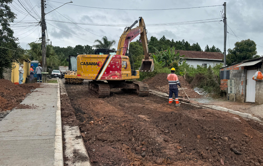 No Jardim Santista, as ações estão concentradas na Rua Kansas e na Rua Caxias do Sul, vias que anteriormente eram de terra. O pacote de obras contempla a execução do sistema de drenagem nas duas ruas, etapa fundamental para garantir a durabilidade do pavimento e prevenir problemas como erosões e acúmulo de água. Na Rua Kansas, também está sendo implantado um muro de gabião, estrutura de contenção que contribui para a estabilidade do solo e a segurança da via.