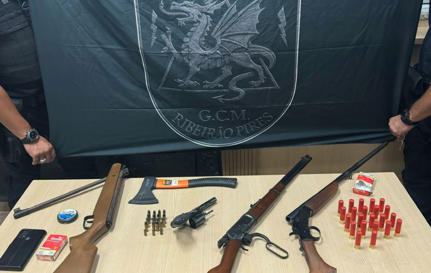 A Guarda Civil Municipal de Ribeirão Pires e a Polícia Civil do Estado de São Paulo prenderam em flagrante, na noite da última segunda-feira (9), homem por violência doméstica e crimes relacionados à posse irregular de armas de fogo, no distrito de Ouro Fino Paulista. A ação resultou na apreensão de revólver, espingarda, carabina, arma de pressão e munições de diferentes calibres.